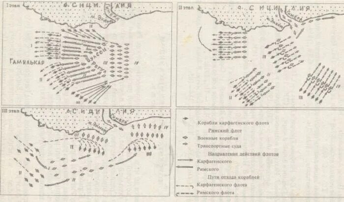 Постепенно римские моряки стали приходить в себя, и «вороны» полетели в пентеры. Грохоча досками мостков, легионеры бросались на абордаж. Но тем временем правое крыло Ганнона, обходя сражающиеся в центре корабли, атаковало четвертую эскадру римлян. Те запаниковали и стали отступать. Гамилькар же, пройдя вдоль берега, врезался в строй третьей римской эскадры. Сражение разделилось на три отдельные битвы.
