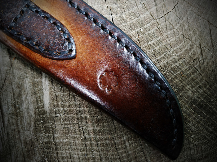 Прошит вручную вощеной нитью седельным швом, края скруглены, окрашен, вскрыт аппретурой и воском.