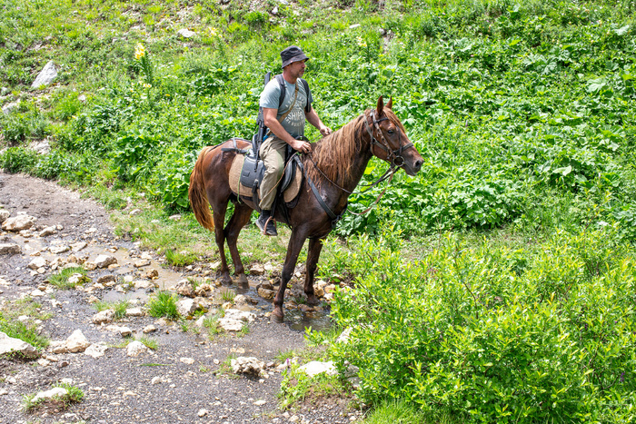 Вообще, тут лошади не только способ передвижения, но и доставки грузов, перевозки туристов и их вещей. Есть еще вертолет, но стоит дороговато, хотя выглядит впечатляюще - видели такой у балагана с кафе у Ашота (Аллы), где пекут те самые вкуснейшие лепешки.