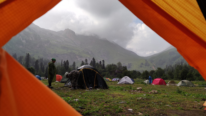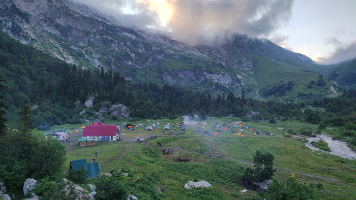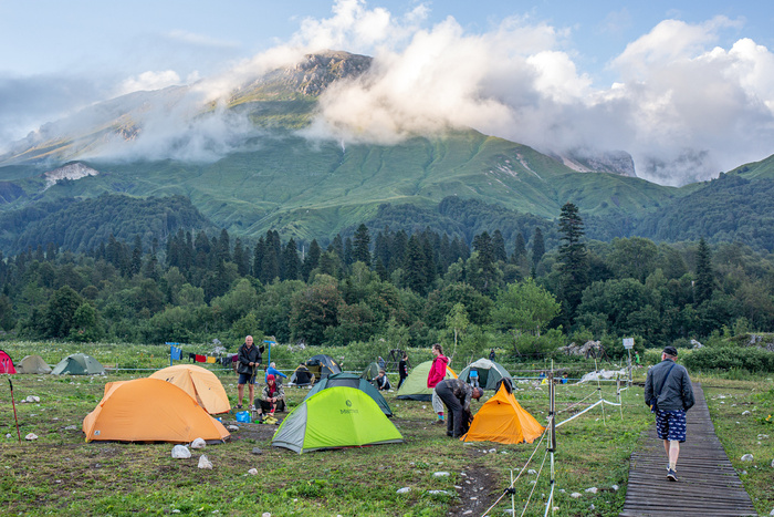 Здесь нужно пройти инструктаж у егеря и подкупить припасов в виде тушёнки или гречки, например. Также есть летний прохладный душ и умывальники. Ночью туристы здесь жгут костры и дружно поют под гитару. В целом развлечений много, почему-то бросилось в глаза, что и пьяных туристов достаточно.