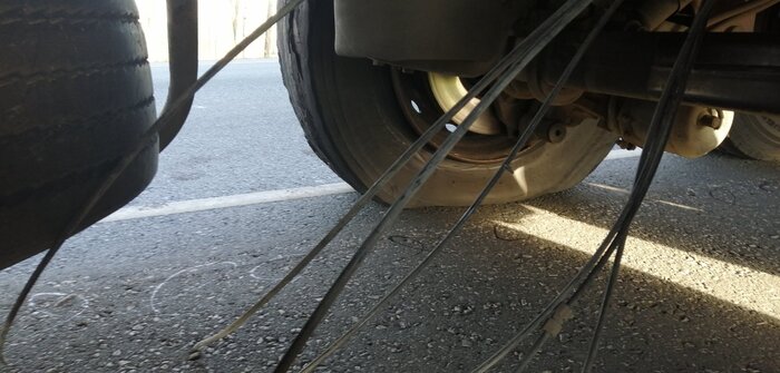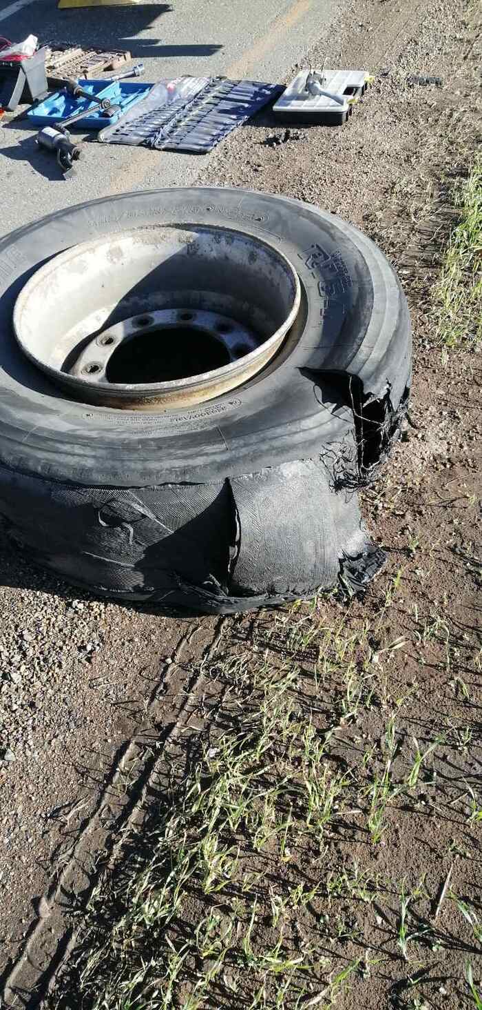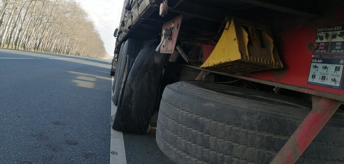 Прошли Лаяшты, дальше ремонтов вроде нет и нам сулила удача спокойную езду до самой выгрузки. Знаете же там чистое поле такое красивое и дорога на насыпи. Вот там я услышал БАХ. Пятнадцатый канал трезвонил о том, что у меня колесо взорвалось, спасибо ребятки, я уже понял. В первую секунду я подумал о грузе, ведь везли стеклянную бутылку, переживал чтобы волной не похлопало, но на вторую секунду я увидел как лихо мои монометры идут к нулю, а воздух с крана воет как волк на луну. Думаю, ну что там? подушку зацепило? да и фиг с ней, у меня в запасе прицепная есть. Прижались к обочине и ах... Мне оторвавшимся пластом резины перебило все трубки идущие на кран принудительного поднятия/опускания подушек полуприцепа и кран растормаживания того же полуприцепа. Выглядит это не очень.