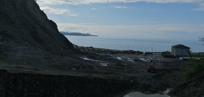 Пора было выбираться отсюда и мы рванули на выезд. Стоит оговориться, что это были майские праздники когда Владимир Владимирович объявил двухнедельные каникулы для всех смертных, поэтому на ближайшие 5-6 дней искать обратную загрузку не было смысла и решение пришло максимально быстро. Ищем где можно бросить кости на несколько дней. Таким макаром мы доехали до Лермонтово. Там громили скалы для отсыпки пляжа и мы встали прямо напротив этого действа гадая долетит до нас камушек побольше или нет.