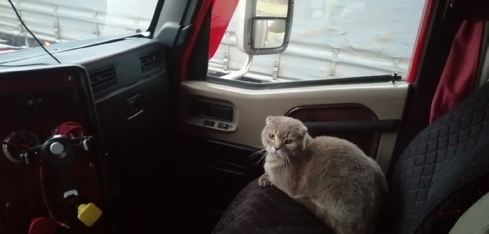 Выгрузка прошла в целом без проблем. На обратной дороге заехали в свою деревню, мне надо быдло домой забрать моего пушистого засранца, кончилось его лето в огороде, пора было забирать домой на зимовку. Он был немного ошарашен такой машиной. Хоть и любит ездить, но фура оказалась шумноватой для него.
