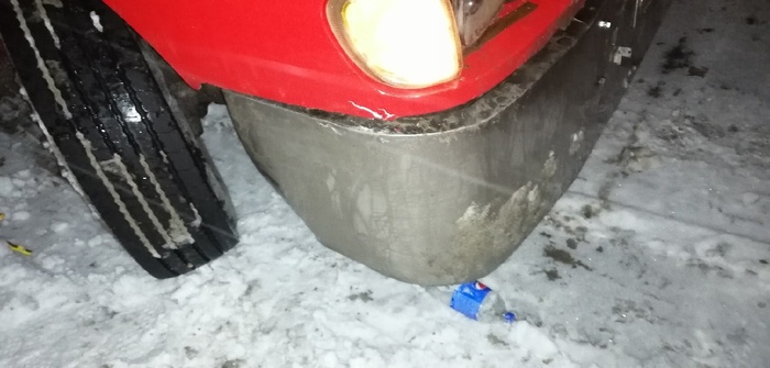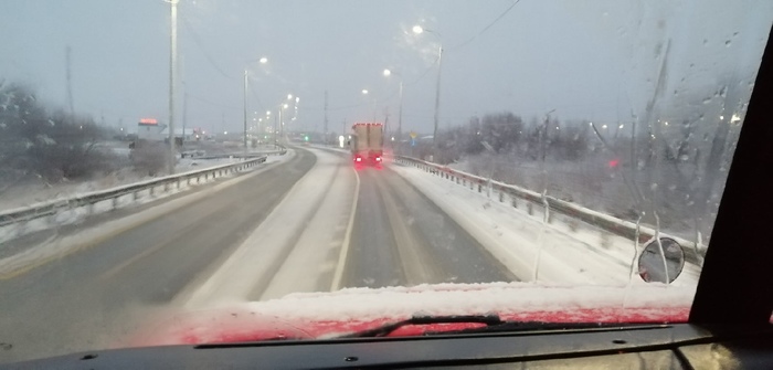 К сожалению для меня начало рейса было просто ужасным. За час до данного фото я чуть не сложился на спуске. Как итог, тормозил бампером об сугроб. Всё бы хорошо, но под сугробом оказался бетонное ограждение. И надо было напороться именно на него. Как итог загнутый бампер.