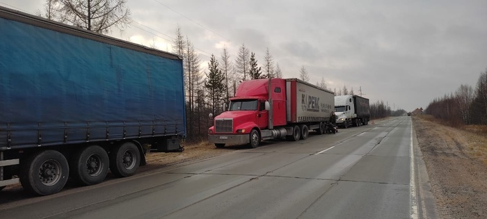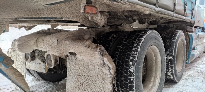 А вот тут кстати вспомним разговор о неудачах. После погрузки мы проехали около трёхсот километров и встали на ночёвку из-за гололёда. Утро выдалось шикарным. Качаем воздух и тут два толчка по моей машине. Я думал в меня кто то впендюрился по утру не проснувшись.