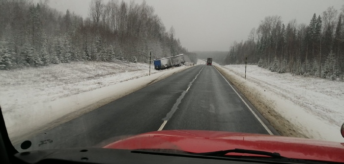 Дальше ехали по той же тактике. Пока гололёд не появится и не пропадёт мы стоим, машина на гололёде всё так же плохо управляется на резких поворотах, а я переживаю за себя, машину и самое главное о других участниках движения. Не хотелось день свой закончить так же как этот товарищ, по первым заморозкам довольно частое явление
