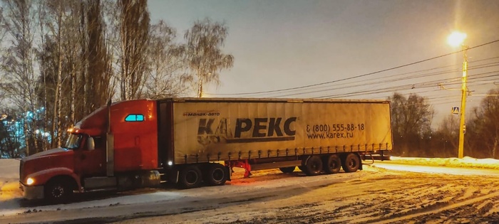 Как Вы успели заметить по фотографии, выпал снег. Угу, первые заморозки мы встретили именно здесь. И как выяснилось есть один существенный косяк. Седло на тягаче отодвинуто было назад и основной вес шёл на два задних моста. О чём нам это говорит? Пральна! Зад нагружен, а перед нет. Вот тут я маленько прифигел когда на повороте кручу рулём, а по гололёду машина едет прям не имея зацепа на переднем мосту. Приятного мало, опасно. Потому каждый последующий день мы ехали только после того как машины растопят утренний гололёд на трассе.