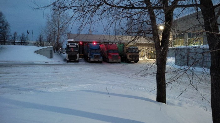 Весь январь мы проваляли дурака :D Запас финансов был, на дороге творился ахтунг из-за снега, так и решили пропустить тот месяц когда Россия просыпается от новогоднего угара и начинает потихоньку работать. Хоть и заняться в основном было нечем, но каждые пару дней мы приезжали на стоянку дабы скинуть снег с прицепа. Во-первых, ни один тент не любит когда на нём сверху лежит куча снега которая со временем превращается в лёд. Во-вторых, подобную процедуру стоит делать и в дороге. Никто не любит когда ему с крыши фуры летит льда в лобовуху. От этого страдают и фуры тоже, на синей так в прошлом году разбили лобовое стекло.