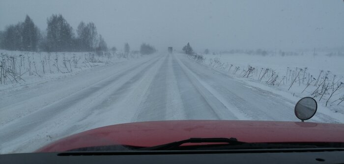 Таким видом нас встретила объездная у Гаврилов ям, что между Иваново и Ярославлем. Наша полоса ещё более менее чистая, а вот ребят на встречке мы предупреждали, что за закрытым поворотом у них в полосе сугроб выше бампера. Мы не шибко ребята опытные, поэтому по таким дорогам ездим на скорости 40-70, нас же огоняли на 90-100 км/ч. Там либо ребята на опыте, либо шило в жопе, их дело.