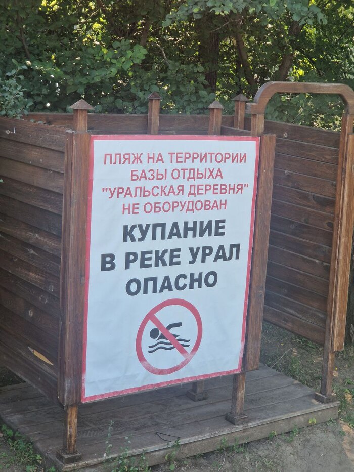 База расположена вдоль русла реки Урал. баннеры настоятельно указывали на не безопасность купания)) Но утром мы всё же не удержались. Жара. Течение очень сильное и становится ясно что если тебя унесёт, то на крутых берегах будет сложновато выйти, видимо в этом основной нюанс. Вода прохладная )) мокрая.