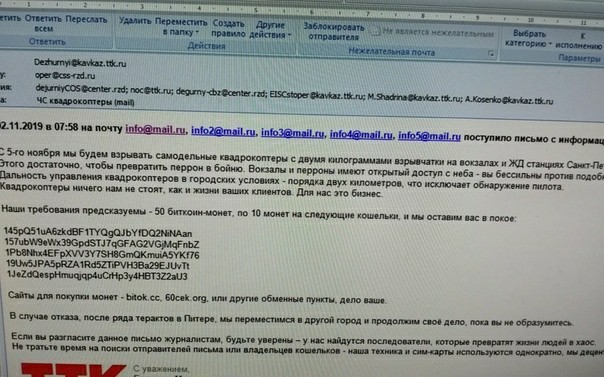 В управление ОКТ ж.д. поступила угроза террористической атаки с воздуха, по средством квадрокоптеров с 2кг бомбами.