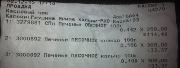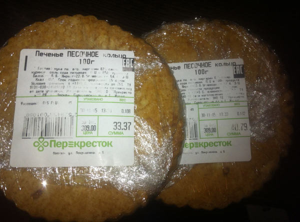 Сегодня вечером зашёл в магазин, купить печенек к чаю и пару песочных колец. Одно стоит 33.37, второе 40.79 (разный вес).