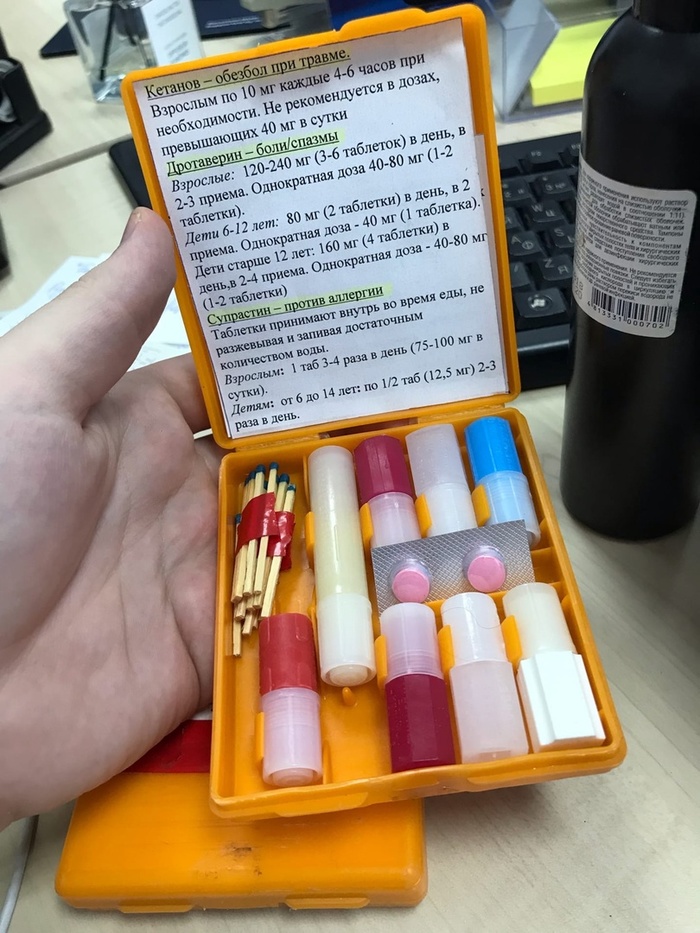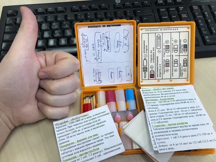 Если у вас память такая же, как и у меня (а она как у хлебушка), то вы можете сделать себе мелкие шпаргалки, с наименованием фармы, ее дозировки и кратко описать суть. И эти шпаргалки прикрепить к внутренней крышке, где располагается старая схема капсюлей АИ-2. Таким образом, вам не придется особо мучаться с запоминанием наименований (а они порой дикие), вы всегда сможете прочесть что для чего и сколько нужно принять. А если аптечку возьмет кто-то другой по вашей просьбе, то человеку не придется мучаться расспросами.