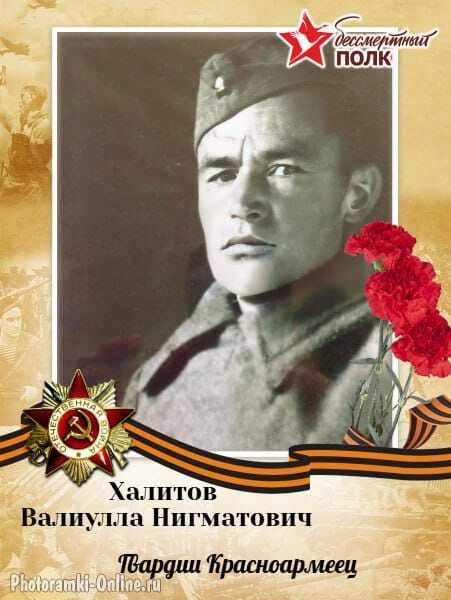 Мой дед по отцу. Халитов Валиулла Нигматович. 1901года рождения. Умер до моего рождения. Но по трепетной памяти всех его 9 детей ( 10 умер в младенчестве) я знала о нём больше чем о себе, гоняли на его УАЗике , который как кабриолет летом, а зимой тентом покрытый, в нём пипец, как холодно, жила и воспитывалась в этой потрясающе сплоченной семье, где все за одного. Альберт погибший- его внук, сын его дочери. Второй дед- Габбасов Файзрахман- воевал на финской войне, не успел вернуться, как новая война. Пропал без вести под Москвой в декабре 41-го. Бабушка осталась одна с детишками. Любила его и ждала всегда. Мы от её веры в его возвращение, даже сами не воспринимали, что он погиб. Идрисов Руслан, его правнук. Погиб, спасая раненых. Совсем мальчик.... Вот и вся история. Вечная им память