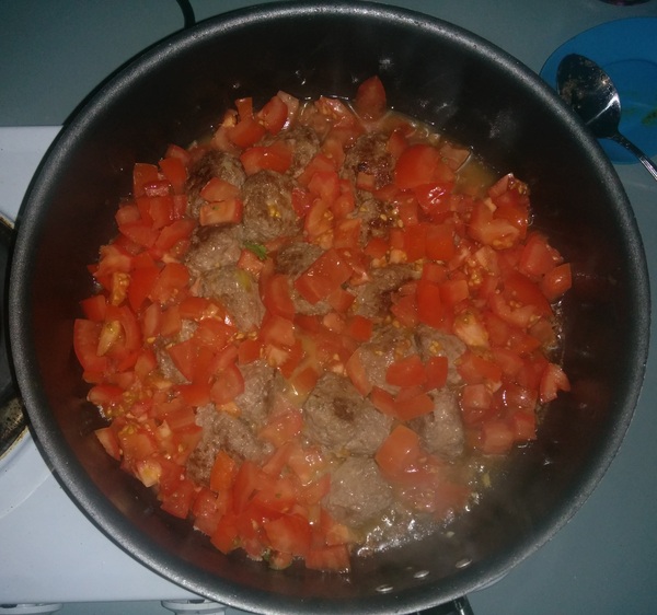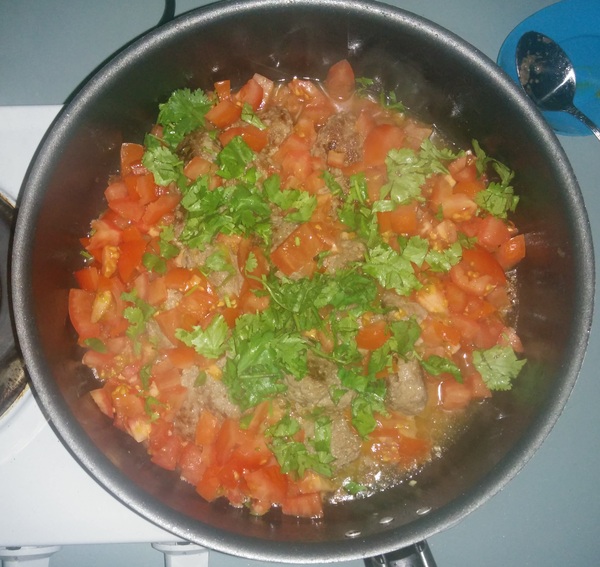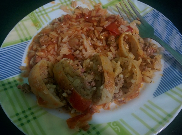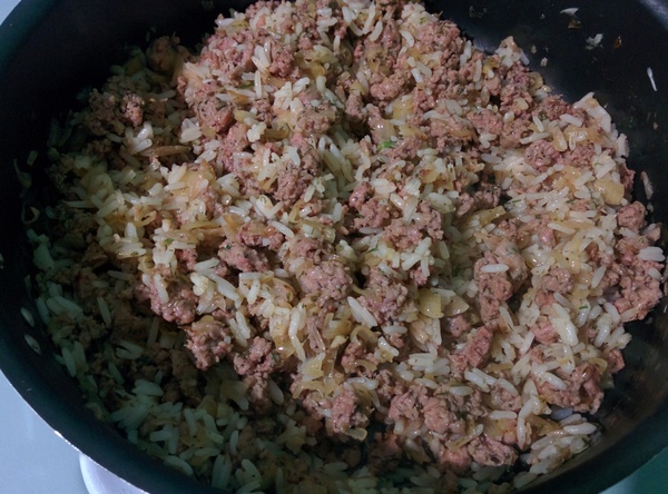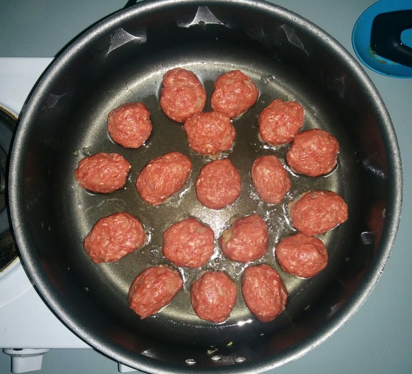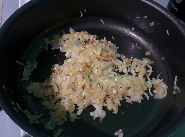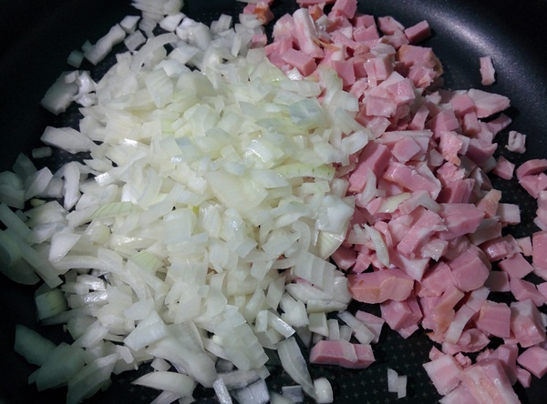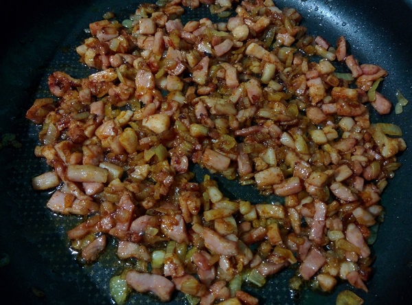 Для соуса все ингредиенты смешиваем и оставляем в стороне. Берёмся за фарш. Нарезаем как можно мельче лук и грудинку. Обжариваем до момента, когда грудинка станет хрустящей.