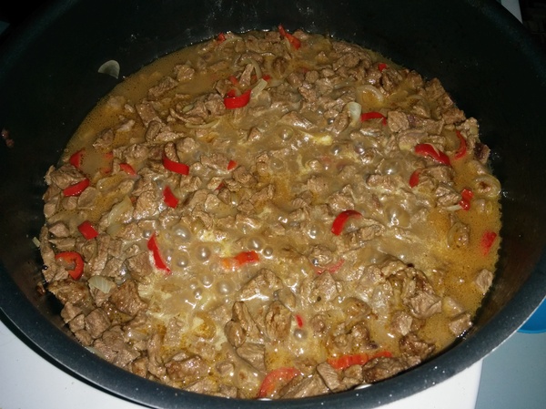 Болгарский перец нарезаем полосками шириной 1,5-2,5 см. и обжариваем с двух сторона по 2-3 минуты.