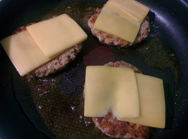 На небольшом количестве растительного масла обжариваем котлеты с двух сторон по 3-4 минуты с каждой стороны . Когда перевернете котлету первый раз, сверху положите сыр, пусть начнёт немного плавиться. Убираем котлеты на тарелку и накрываем фольгой, чтобы сыр окончательно расплавился, и котлеты остались горячими.