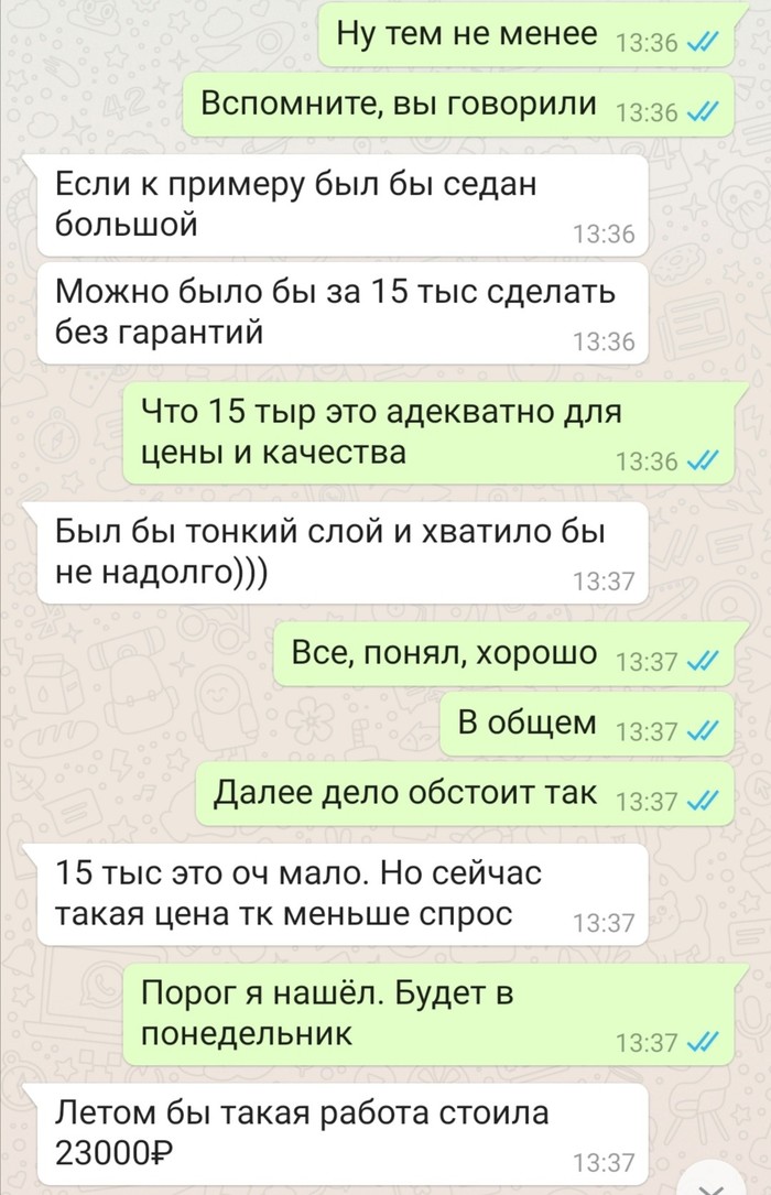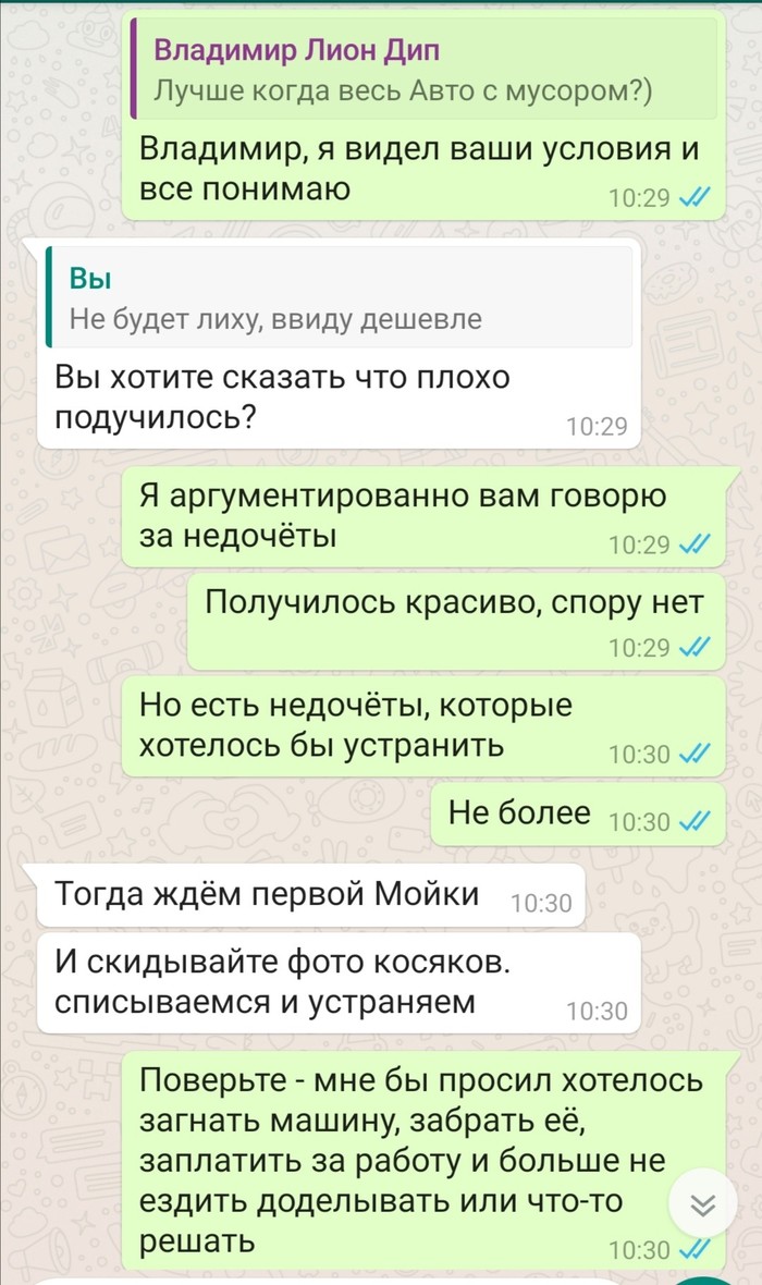 В итоге договорились, цена, качество, я много раз уточнил, чтобы было хорошо сделано, вопрос не в цене, от 5к сильно не изменилось бы в кармане, главное качество. Полтора дня и пишут забрать авто, кидают фото.