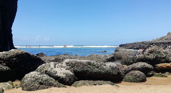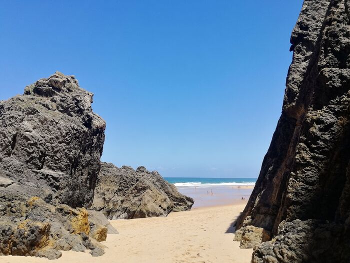Так как мы ни фига не сёрферы и были там в конце июля,больших волн не застали.Солнце было жарким,а вода холодной.Масштабы пляжа впечатляют,так же как и не многолюдность.Прогулялись до скал в конце пляжа,искупались,позагорали,потом залезли в прибой.