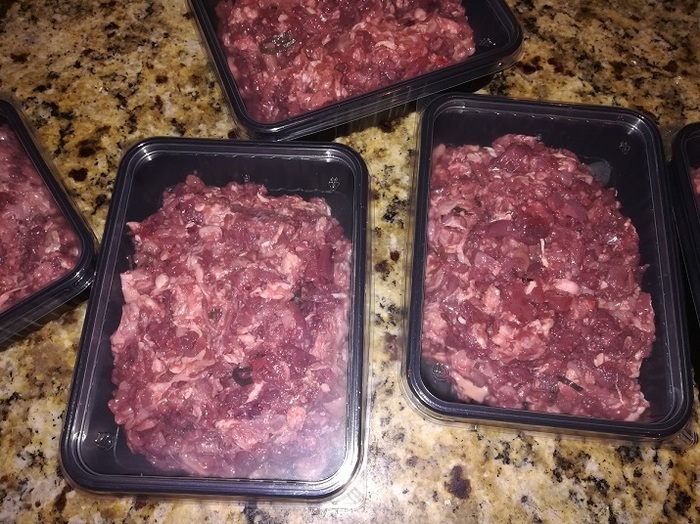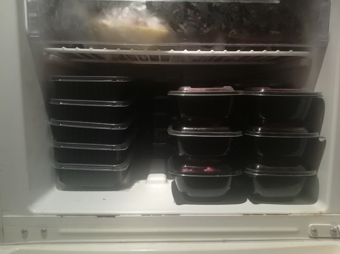 Далее я всё раскидываю по контейнерам, купленным за копейки, и ставлю минимум на два дня в морозильную камеру, что бы мясо полностью заморозилось (как мне говорили не однократно говорили - простейшие погибают при разморозке), и затем уже с ночи достаю контейнер, и к утру можно уже давать еду котам).