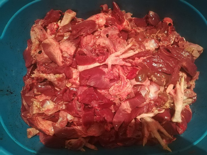 На рынке приобретаются свиные сердца, куриные желудки, куриные головы, куриные лапы, тыква или морковь. При желании можно добавлять говяжий рубец, но наши котики и так уже большие:).