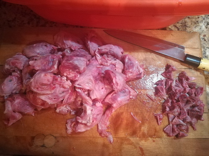 Важная часть мясорубки - пластиковая бутылка на резинке, иначе рискуете потратить кучу времени на мытьё стен. (В основном куриные головы стреляют глазами).