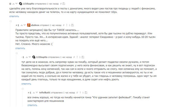Также здесь есть огромное количество талантливых людей, которые своими руками делают что-то необычное, и я уверен, многие и без просьб доната хотели бы перечислять символические суммы в качестве поддержки. Правда, это будет невозможно при закрытом сообществе, но, мне кажется, тема благотворительности поднималась уже ни раз и не два, и, возможно, модерации стоит прислушаться к пользователям и подумать, как реализовать идею.
