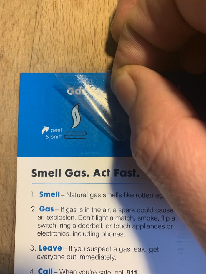 Сегодня получил по почте открытку от газовой компании с инструкцией что делать в случае обнаружения запаха газа. В первом окошке закрытом плёнкой нужно было отклеить пластик поскрести и понюхать. Ну да, воняет этаниолом. Хотя хотелось бы чтобы пахло цветами.