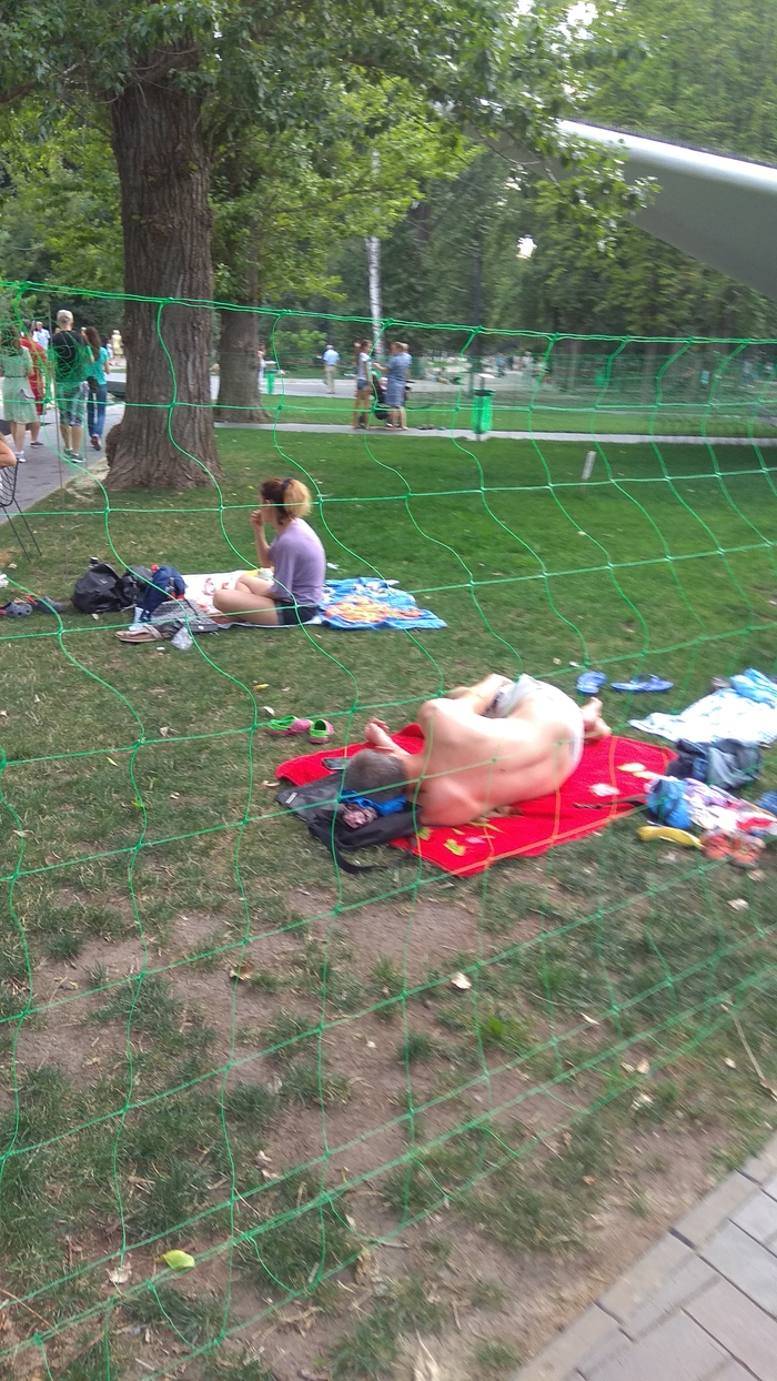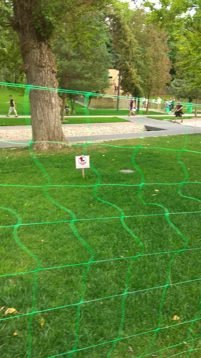 Практически весь парк на данный момент огорожен, остался небольшой кусочек,где можно отдыхать на газоне. Все там, кроме этих уникумов.