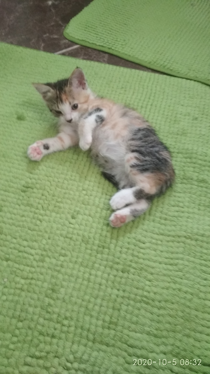 Встретили на остановке, мелкая совсем. Помыли, обработали. Лоток нашла без помощи. Жена зовёт её Тоська, но это не точно.