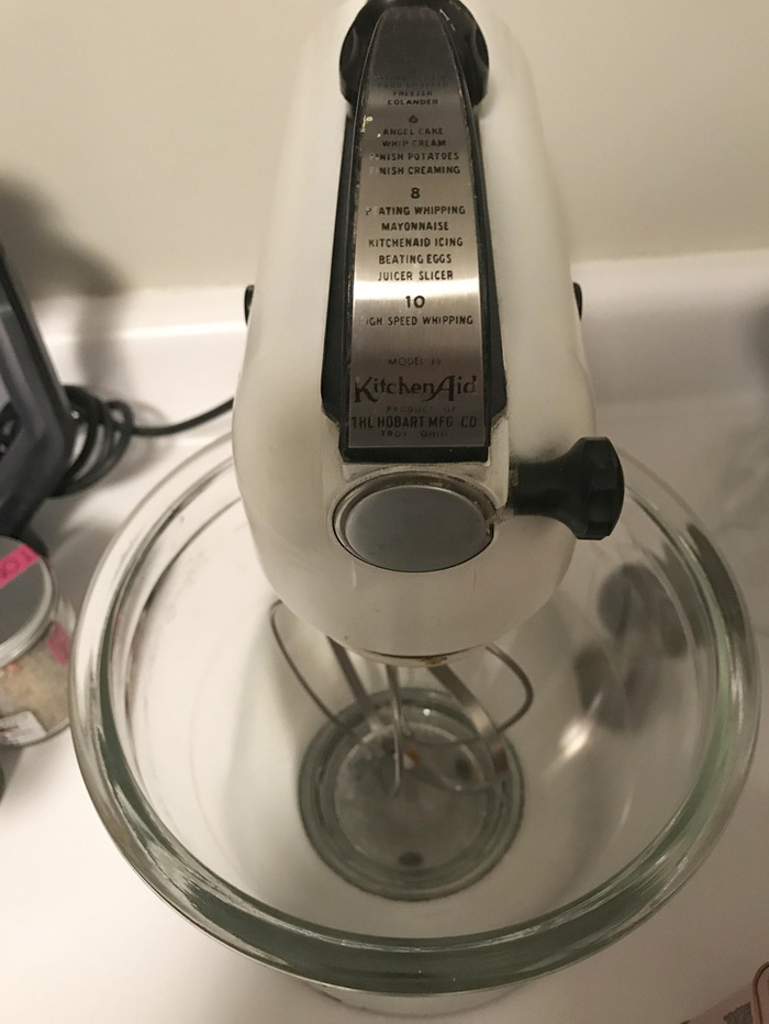 Миксер KitchenAid, сделан в 1940-х, куплен за 5 баксов, использовался почти каждый день 7 лет. Дважды роняли стеклянную чашу на пол. Работает!