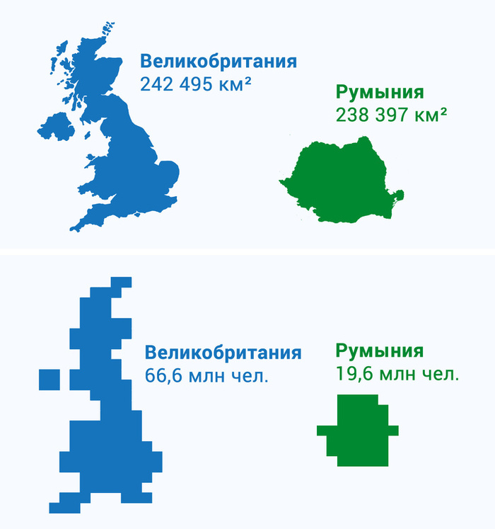 Великобритания не особо меняет свои очертания, а Румыния становится похожей на шышку.