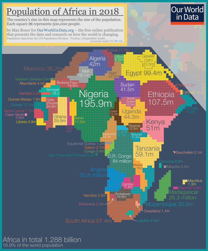 Картограмма — это способ картографического изображения статистических данных (в данном случае данные о населении Земли за 2018 год). Каждый квадрат на демографической картограмме Макса Розера — это 500 тыс. человек населения страны. Ну а всего на его картограмме разместилось 15 266 квадратов — это все 7,633 млрд человек в мире.