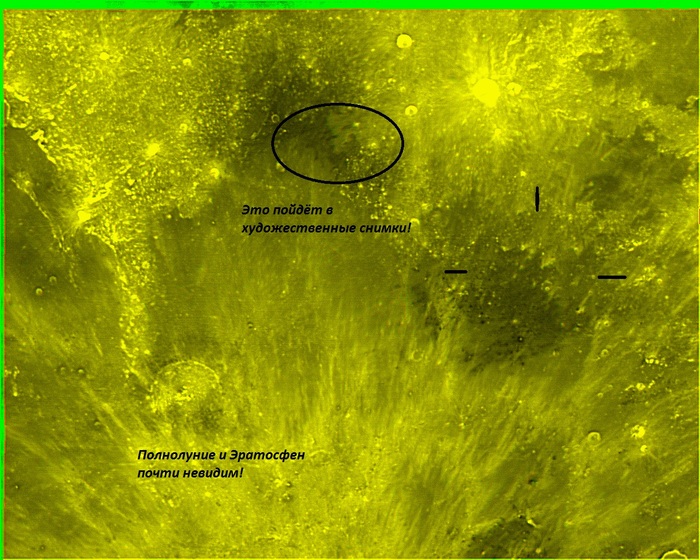 Кстати, самый крупный их «новых» кратеров на днище Птолемея при подходящих атмосферных условиях в силу «Эффекта Бенхема» даёт у меня на телескопе для моих глаз жёлтый ореол, как и центральная горка Альфонса. Напоминаю, что матрица в моей системе работает в тёмно-красном участке спектра.