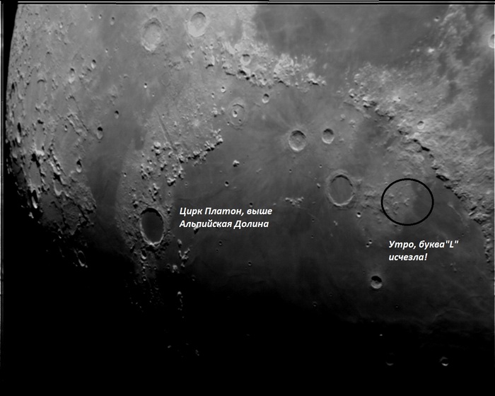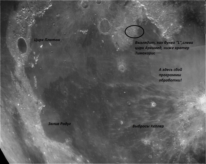 Фотография буквы «L» - её видно на Плато Архимед в других условиях освещения. Это просто холмы, но в комбинации с собственными тенями вполне на «латиницу» похожи! Вот с разбитыми центральными горками кратеров вопрос сложнее, но тоже вроде ничего особенного там нет.