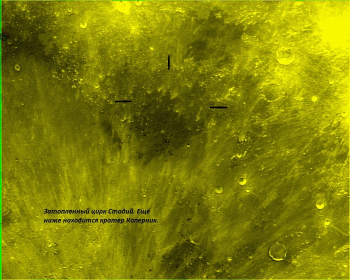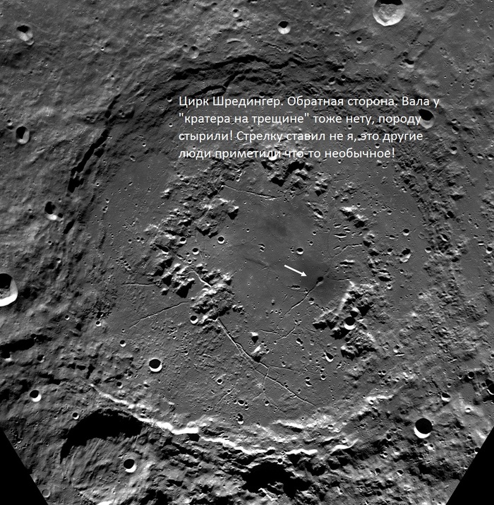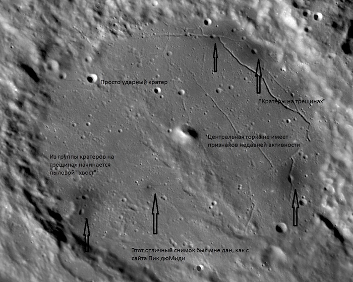 Мне стало интересно, что же там делается, потому, что я уже знал об интересных результатах наблюдений проф. Козырева. Этот цирк давно известен своей «аномальной активностью». Часть этой активности, а именно, «вулканическая активность» центральной горки кратера, затем была объяснена мной чисто зрительными эффектами. (Примерно так же объясняют кажущийся «вулканизм» в этом цирке и другие авторы в сети, не я первый до этого додумался!). Но я вроде-бы первый чётко сказал, что связанные с его центральной горкой видимые «аномалии» являются следствием «Эффекта Бенхема». Это чисто зрительный эффект, связанный, в нашем случае, с атмосферной турбулентности. Понятно, что такое простое объяснение одной из странностей этого цирка не снимает вопросов с другими аномалиями в этом районе. Об этом цирке можно много писать интересного, но мы сосредоточимся на вот этих странных «кратерах на трещинах». Этот снимок мне попал с сайта «Пик Дю Миди! Он имеет оптимальное разрешение. На нём мной эти кратеры отмечены стрелками.