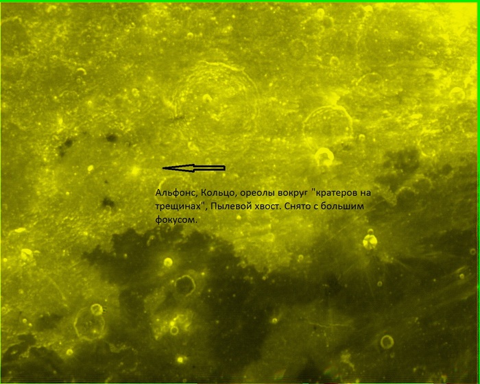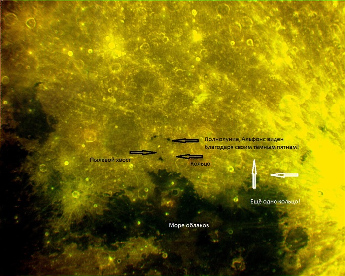 Первое такое «кольцо» я увидел уже после многих лет наблюдения, разглядывая свой снимок поверхности цирка Альфонс. На его днище меня удивила какая-то сероватая «ниточка»! Разглядывая её, я заметил, что она замыкается в правильное кольцо, частично лежащее на залитом лавой когда-то, миллиарда три лет назад, днище Альфонса, а частично, на прилежащем к нему ещё более старом «материке», в сторону Моря Облаков. Показывал снимок разным людям, некоторые действительно видели это «кольцо», некоторые не видели. Как и следовало ожидать, их сразу увидела группа медиков-рентгенологов, которые привыкли высматривать малоконтрастные объекты.