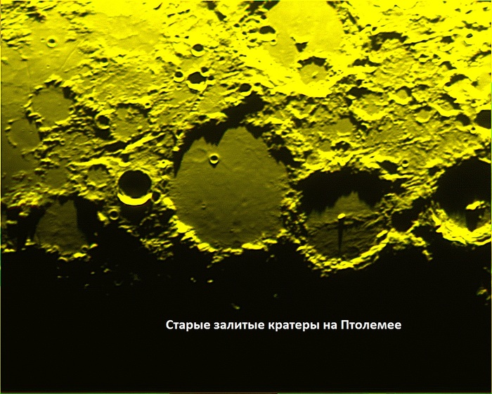 Небольшая добавка: Нашёл несколько интересных и хороших снимков: Хороший утренний снимок Птолемея. Там видна масса мелких неровностей. Это пока Солнышко ещё низко. Когда оно поднимется выше, эта «наждачная бумага» исчезнет, зато станут видными залитые лавой старые кратеры.
