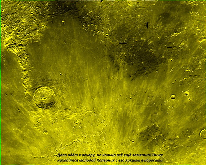 Фото 2. Снимок бОльшего масштаба, ККК, на одном выделены кольца на Альфонсе и второе, менее контрастное и несколько большего размера, между Альфонсом и Тихо.