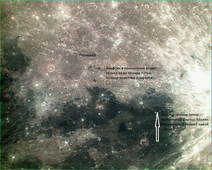 Объект этот действительно малоконтрастный, но в полнолуние он виден гораздо лучше, чем сам Альфонс! Альфонс в полнолуние можно заметить по яркой центральной горке и декорирующим цирк тёмным ореолам разбросанного вещества вокруг его удивительных «кратеров на трещинах». Вал Альфонса при этом почти незаметен. Само это «кольцо» лучше всего наблюдается дня четыре, вблизи полнолуния, когда нет теней и Луна «катафотирует» свет обратно, в сторону Солнца и Земли. Потом выяснилось, что «Кольцо Альфонса» есть на снимках американского аппарата «Клементина» и даже «Койперовского Атласа Луны»! Но в «Атласе» снимки на слишком контрастном фотоматериале и кольцо видно плохо.