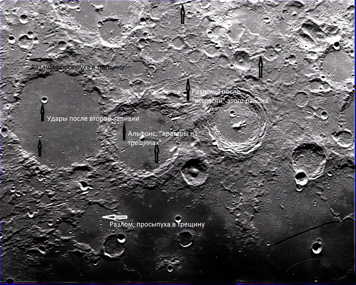 Действительно, в этом районе разломы есть, материковая кора Луны разбита на блоки размером так километров сто-двести и они отлично видны на снимках. Один из разломов прошёл по цирку Альфонс видимо, уже после затвердевания его днища. Эти разломы могли быть вызваны сейсмикой от далёкого взрыва, например, образовавшего Море Дождей. Да и другие события могли внести свою лепту. То же Море Восточное является мультиринговым кратером и его диаметр километров семьсот. Если экстраполировать энергию взрыва от земного кратера Рис, то получится где-то 200 000 Гигатонн! Конечно, экстраполяция дело рискованное, но порядок величины может дать. То есть, на Луне далеко не всегда было спокойно! Земля в этом плане тоже не отставала, была побита ударами астероидов, комет и, наверное, ещё всякими штучками. Но здесь следы ударов сильно «затёрты». А вот Луна осталась почти в первозданном виде после прекращения интенсивных «камнепадов» три-четыре миллиарда лет назад. Наблюдая её в любой телескоп, мы как-бы видим нашу планету далёкого прошлого. Рай для геолога!