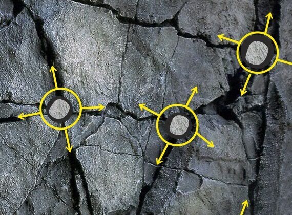 Важно создать в материале нужное распределение температуры, а дальше он сам себя порвёт. Ну, а раз мы знаем, как это работает, то дальше процессом можно управлять! Если просто разбить глыбу на две-три части, сверлим одну дырку на глубину 0,7-0,8 размера и как-то разогреваем изнутри. Битой на мелкие кусочки негашёной известью, которую в дырке заливаем водичкой, тем же, (более дорогим), «спецпорошком» с водой.