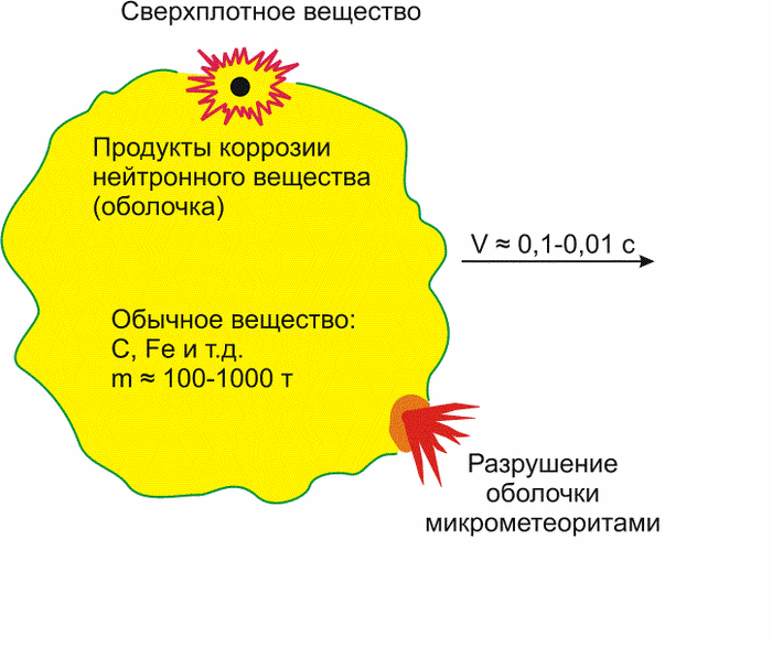 Есть веские основания предполагать, что на поверхности такого объекта при разложении нейтронного вещества возникает корка обычного вещества — «оболочка», с возможной массой от килограммов до тысяч тонн. Нейтронный объект перекатывается по ней, наплавляя всё новые слои (наверное — железа и углерода), и из оболочки она превращается в нечто, похожее на фрагмент снежной бабы. Время от времени при столкновениях с микрометеоритами оболочка (к нашему счастью) разрушается, и в виде фрагментов попадает в космическое пространство, где постепенно распыляется до газа от столкновений с атомами и пылинками межзвёздной среды. Продукты распада таких сверхплотных тел — пары тяжёлых элементов и гелий. В нашей системе отсчёта они будут представлять собой космические лучи не очень больших энергий.