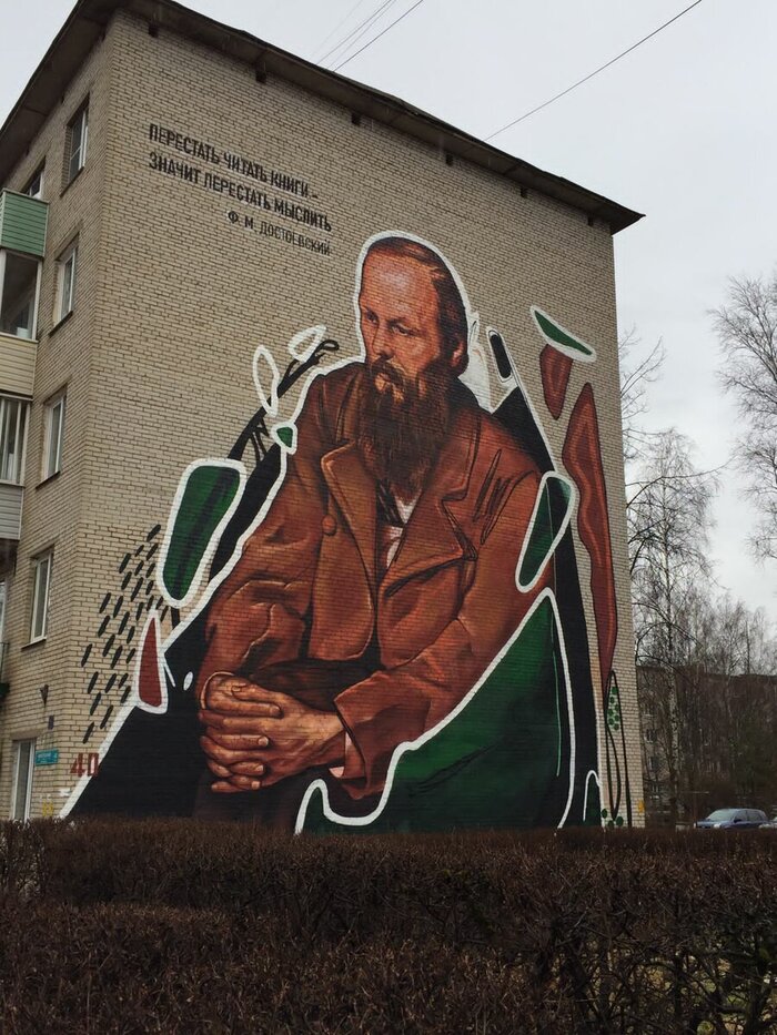 Прогулка в попутном ледоходу направлении привела нас к следующему музею - «Романа «Братья Карамазовы» и белой малоэтажке с изображениями Грушеньки и Настасьи Филипповны. Своеобразно, красиво. Дополнительную нотку драматичной безысходности вносят чьи-то фамильные труселя, тоскливо сохнущие под дождем.
