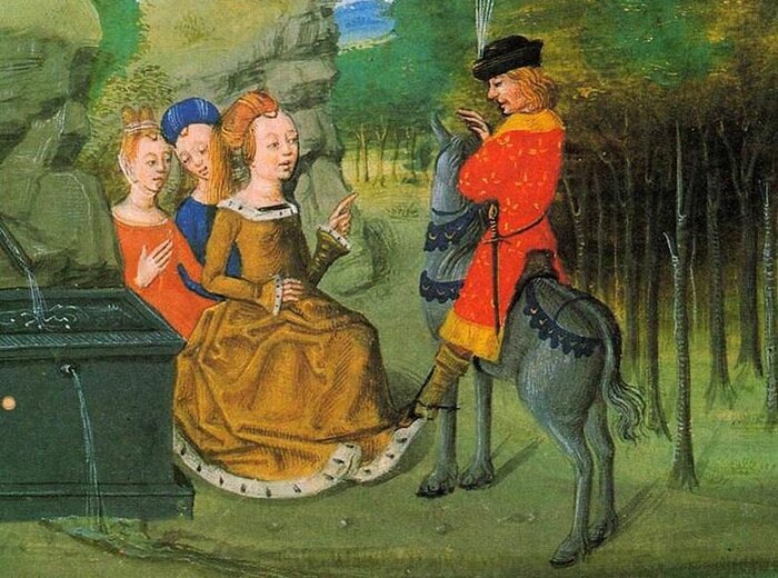 Жил во Франции граф - Эммерик Пуату. Богатый, успешный, состоявшийся. И взял он на воспитание Раймонда де ла Форе, сына другого графа, основательно беднее. Однажды, во время охоты, уже заблудившись, устав, в потемках, Раймонд нечаянно зарубил покровителя. Ну, вот так он размахивал мечом, спасая Эммерика от кабана, что убил и того, и другого. Испугавшись содеянного, да и последствий, вскочил он на коня и понесся куда глаза глядят. Куда его глаза в этой темноте глядели, мы не знаем, но оказался он на поляне, а помимо него на ней оказался еще родник, вокруг которого восседали три златокудрые прекрасницы.