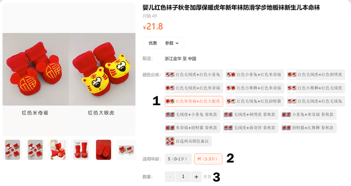 Вот пример, это tmall, на taobao и 1688 немного другой интерфейс, но думаю интуитивно понятно, тем более с переводчиком. Смотрим финальную цену, выбирая 1 цвет, 2 размер, 3 количество. Видим 21.8 юаня за 2 пары носков.