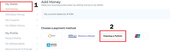 Ищем слева вкладку My Wallet - Add Money (1), нажимаем и открываются способы пополнения. Выбираем перевод в рублях (2).