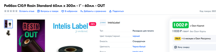 Брал лично для себя. Риббон 60мм на 300м RESIN (смола, это важно) для принтера этикеток (это как копирка для бумаги только для этикеток и она прочнее держится)