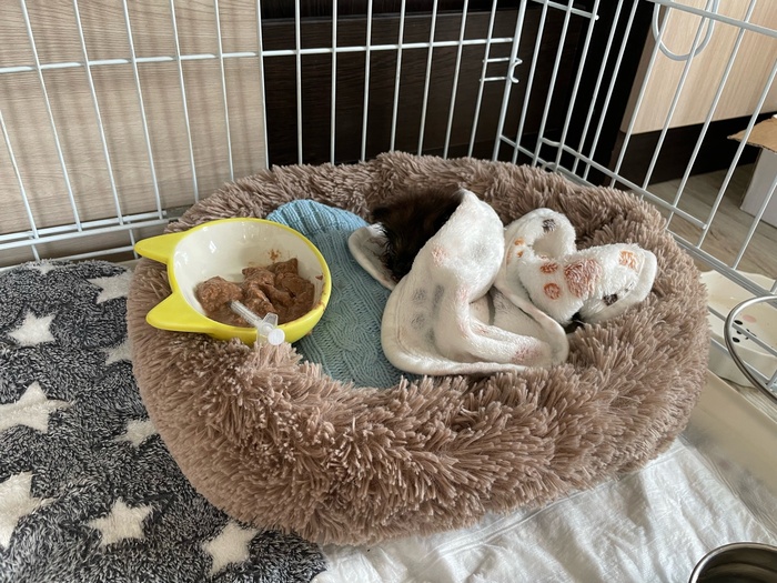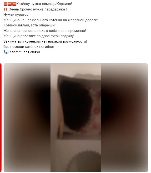 В итоге выяснилось, что женщина, которая нашла котенка, забрала его к себе. Даже сходила в вет. клинику, там котенку обработали раны, назначили лечение. Но, поняла, что не справится и попросила забрать его в приют.