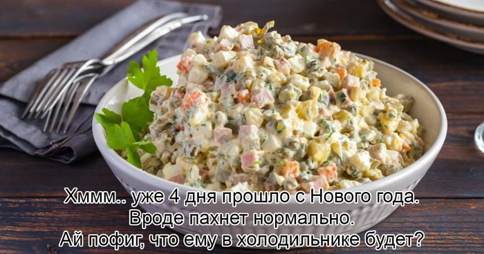 Как работник Скорой помощи хочу отметить, что данный сценарий из года в год повторяется с удручающей регулярностью. Каждый год приходится приезжать на вызов "Болит живот. Рвота. Жидкий стул", где тебе произносят уже ставшей крылатой фразу "- Да это я салат скушала. Я ещё подумал(а), что ему в холодильнике будет? И съела." К сожалению.